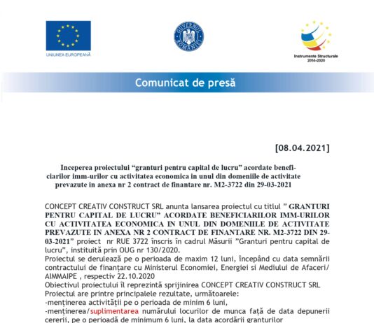 Inceperea proiectului “granturi pentru capital de lucru” acordate beneficiari-lor imm-urilor cu activitatea economica in unul din domeniile de activitate prevazute in anexa nr 2 contract de finantare nr. M2-3722...