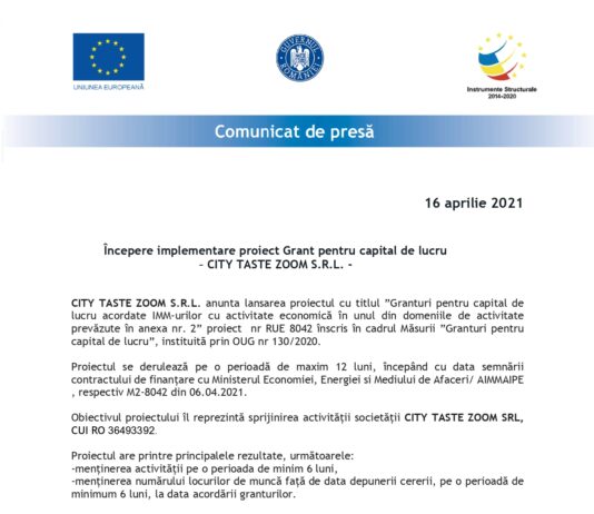 Începere implementare proiect Grant pentru capital de lucru CITY TASTE ZOOM S.R.L.