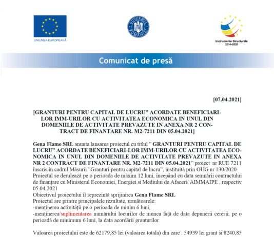 Gena Flame SRL anunta lansarea proiectul cu titlul ” GRANTURI PENTRU CAPITAL DE LUCRU” ACORDATE BENEFICIARI-LOR IMM-URILOR CU ACTIVITATEA ECONOMICA IN UNUL DIN...