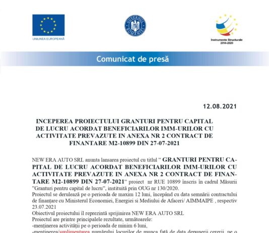 INCEPEREA PROIECTULUI GRANTURI PENTRU CAPITAL DE LUCRU ACORDAT BENEFICIARILOR IMM-URILOR CU ACTIVITATE PREVAZUTE IN ANEXA NR 2 CONTRACT DE FINANTARE M2-10899 DIN 27-07-2021