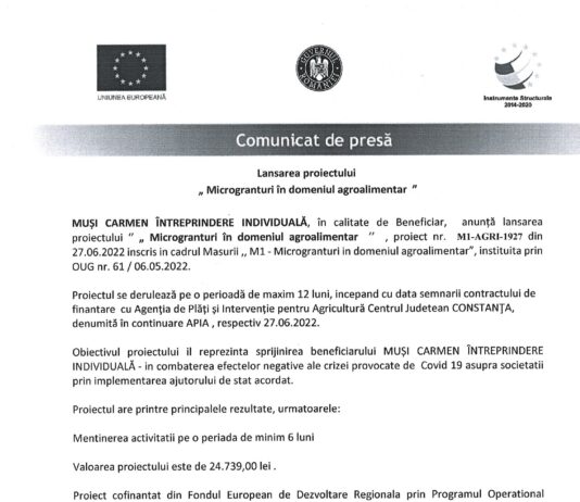 MUȘI CARMEN ÎNTREPRINDERE INDIVIDUALĂ, în calitate de Beneficiar, anunță lansarea proiectului ‘’ „ Microgranturi în domeniul agroalimentar ’’...