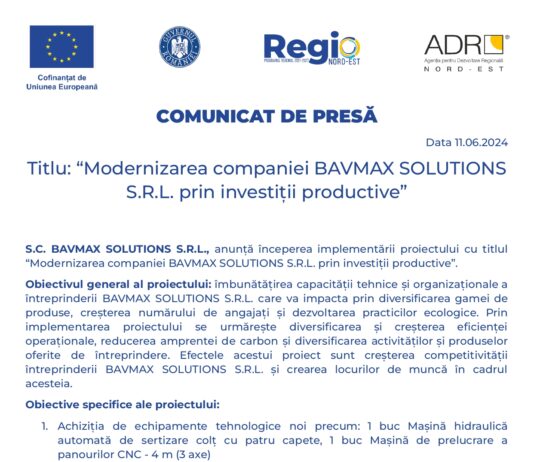 S.C. BAVMAX SOLUTIONS S.R.L., anunță începerea implementării proiectului cu titlul “Modernizarea companiei BAVMAX...