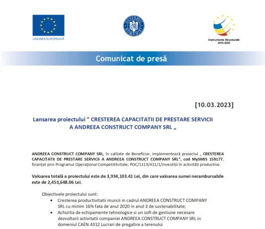Lansarea proiectului CRESTEREA CAPACITATII DE PRESTARE SERVICII A ANDREEA CONSTRUCT COMPANY SRL