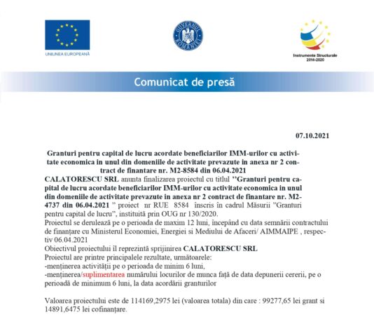 Anunt finalizare implementare proiect granturi pentru capital de lucru CALATORESCU SRL
