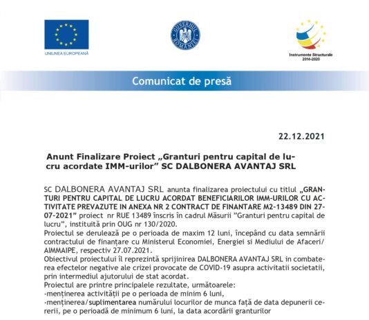 Anunt Finalizare Proiect „Granturi pentru capital de lucru acordate IMM-urilor” SC DALBONERA AVANTAJ SRL