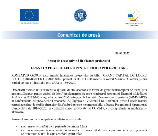 Anunt de presa privind finalizarea proiectului GRANT CAPITAL DE LUCRU PENTRU ROMEXPED GROUP SRL