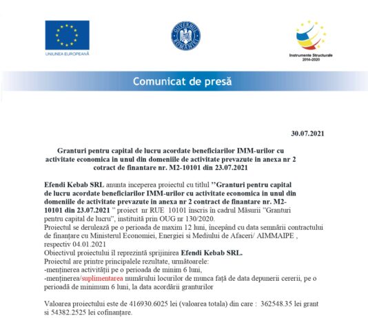 INCEPEREA PROIECTULUI GRANTURI PENTRU CAPITAL DE LUCRU ACORDAT BENEFICIARILOR IMM-URILOR CU ACTIVITATE PREVAZUTE IN ANEXA NR 2 CONTRACT DE FINANTARE M2-12039 DIN 26-07-2021
