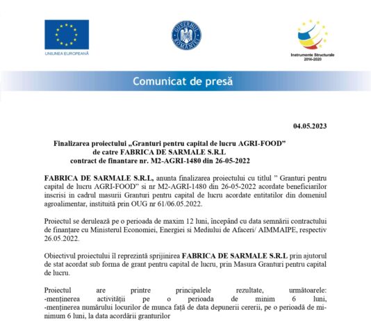 Anunt finalizare proiect „Granturi pentru capital de lucru AGRI-FOOD” de catre FABRICA DE SARMALE S.R.L