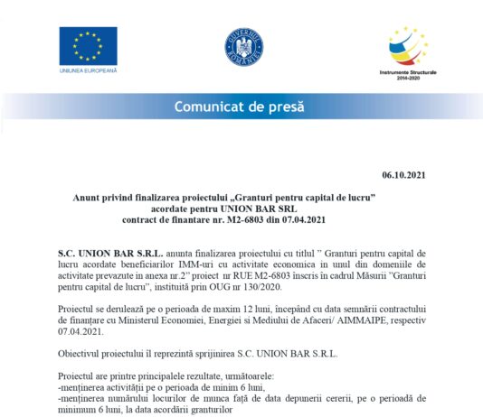 Anunt privind finalizarea proiectului „Granturi pentru capital de lucru” acordate pentru UNION BAR SRL