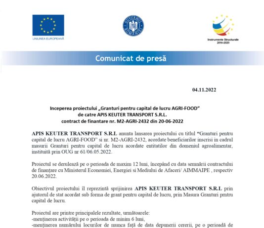 Anunt inceperea proiect„Granturi pentru capital de lucru AGRI-FOOD” – APIS KEUTER TRANSPORT S.R.L.