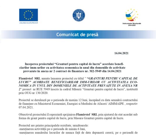 INCEPEREA PROIECTULUI GRANTURI PENTRU CAPITAL DE LUCRU ACORDAT BENEFICIARILOR IMM-URILOR CU ACTIVITATE PREVAZUTE IN ANEXA NR 2 CONTRACT DE FINANTARE M2-9994 DIN 27-07-2021