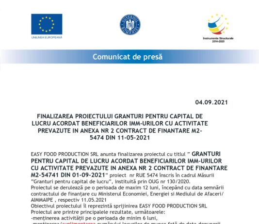 Anunt finalizare proiect Granturi pentru capital de lucru EASY FOOD PRODUCTION SRL