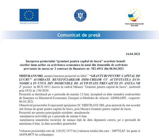 Inceperea proiectului “granturi pentru capital de lucru” acordate beneficiarilor imm-urilor cu activitatea economica in unul din domeniile de activitate prevazute in anexa nr 2...