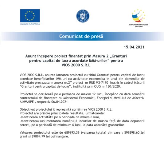 Anunt incepere proiect finantat prin Masura 2 „Granturi pentru capital de lucru acordate IMM-urilor” pentru VIOS 2000 S.R.L