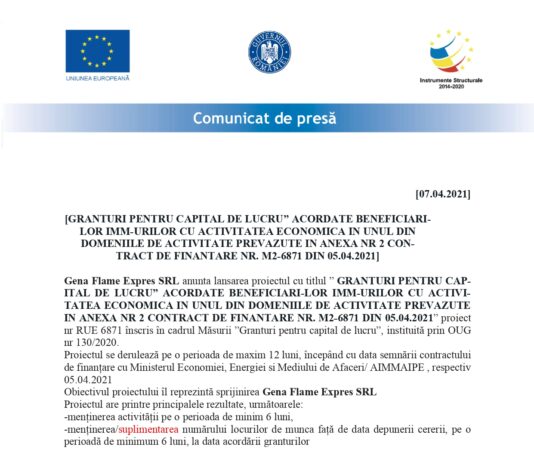 Gena Flame Expres SRL anunta lansarea proiectul cu titlul ” GRANTURI PENTRU CAPITAL DE LUCRU” ACORDATE BENEFICIARI-LOR IMM-URILOR CU ACTIVITATEA ECONOMICA IN UNUL DIN...
