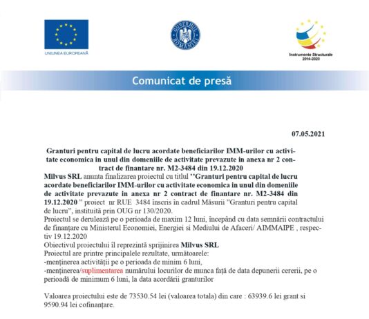 Inceperea proiectului “granturi pentru capital de lucru” acordate beneficiari-lor imm-urilor cu activitatea economica in unul din domeniile de activitate prevazute in anexa nr 2 contract de finantare nr. M2-5571...
