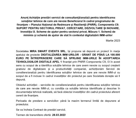 Anunț Achiziție prestări servicii de consultanță/analiză pentru identificarea soluțiilor tehnice MIRA SMART EVENTS SRL
