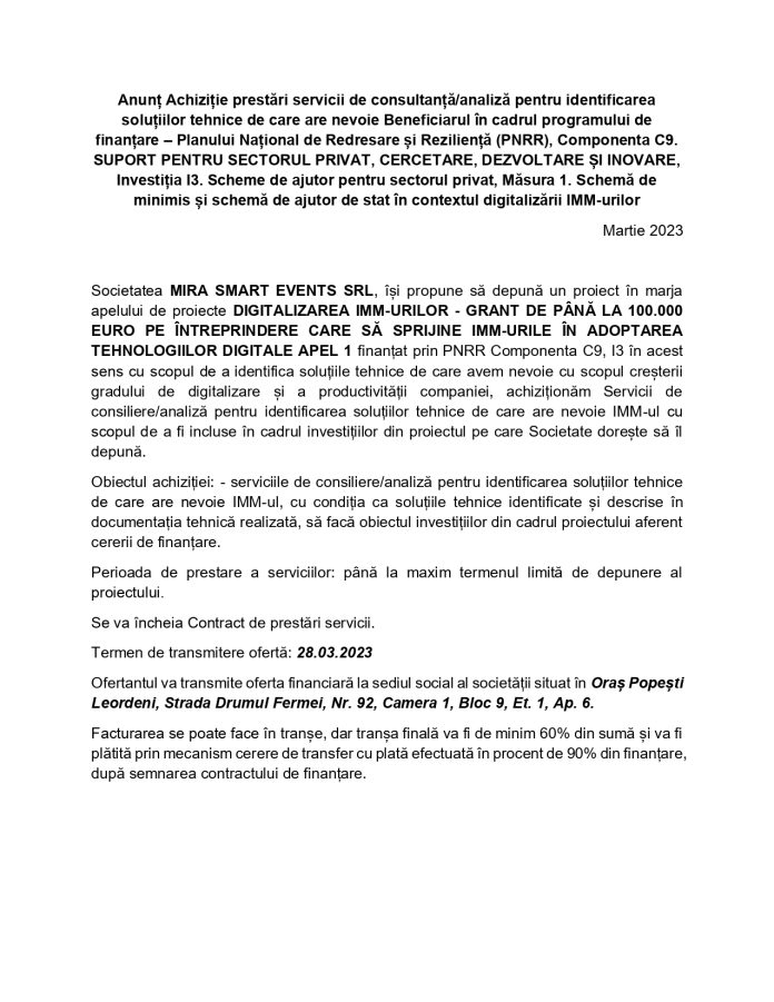 Societatea MIRA SMART EVENTS SRL, își propune să depună un proiect în marja apelului de proiecte DIGITALIZAREA IMM-URILOR – GRANT DE PÂNĂ LA 100.000 EURO PE ÎNTREPRINDERE CARE SĂ SPRIJINE IMM-URILE ÎN ADOPTAREA TEHNOLOGIILOR DIGITALE APEL 1 finanțat prin PNRR Componenta C9, I3 în acest sens cu scopul de a identifica soluțiile tehnice de care avem nevoie cu scopul creșterii gradului de digitalizare și a productivității companiei, achiziționăm Servicii de consiliere/analiză pentru identificarea soluțiilor tehnice de care are nevoie IMM-ul cu scopul de a fi incluse în cadrul investițiilor din proiectul pe care Societate dorește să îl depună.