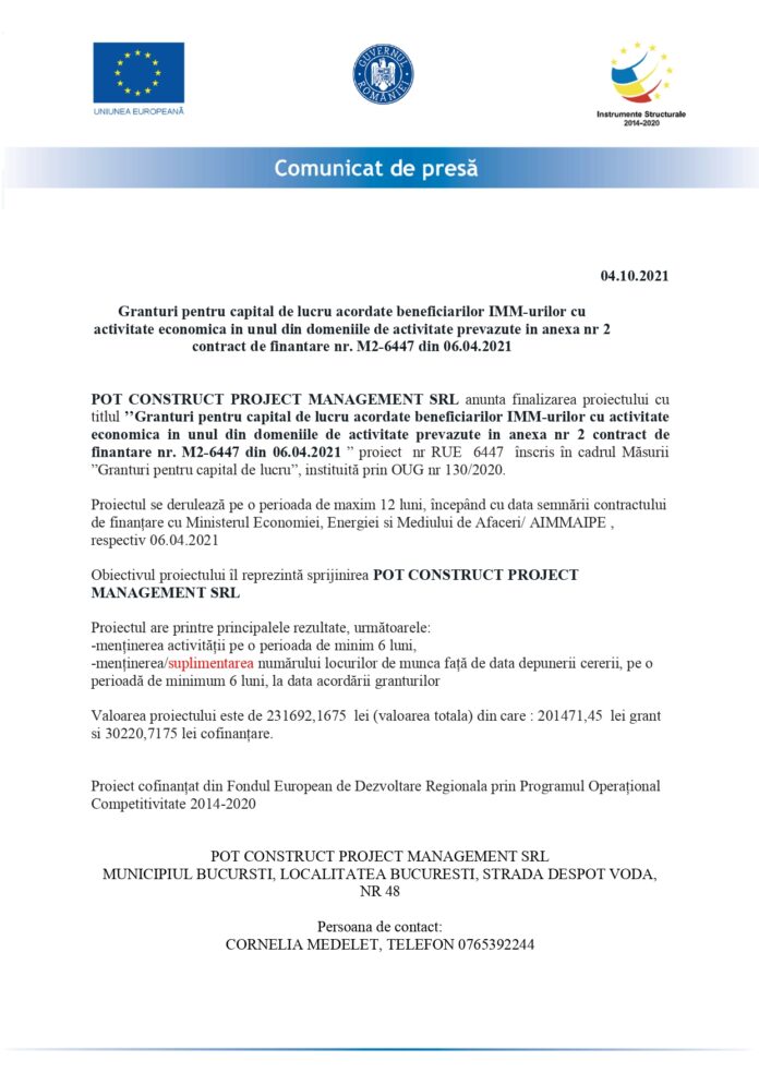 POT CONSTRUCT PROJECT MANAGEMENT SRL anunta finalizarea proiectul cu titlul ’’Granturi pentru capital de lucru acordate beneficiarilor IMM-urilor cu activitate economica in unul din domeniile de activitate prevazute in anexa nr 2 contract de finantare nr. M2-6447 din 06.04.2021 ” proiect nr RUE 6447 înscris în cadrul Măsurii ”Granturi pentru capital de lucru”, instituită prin OUG nr 130/2020.