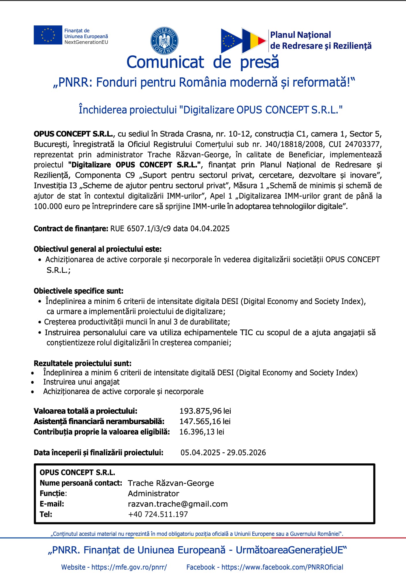 OPUS CONCEPT S.R.L., cu sediul în Strada Crasna, nr. 10-12, construcția C1, camera 1, Sector 5, București, înregistrată la Oficiul Registrului Comerțului sub nr. J40/18818/2008, CUI 24703377, reprezentat prin administrator Trache Răzvan-George, în calitate de Beneficiar, implementează proiectul „Digitalizare OPUS CONCEPT S.R.L.”, finanțat prin Planul Național de Redresare și