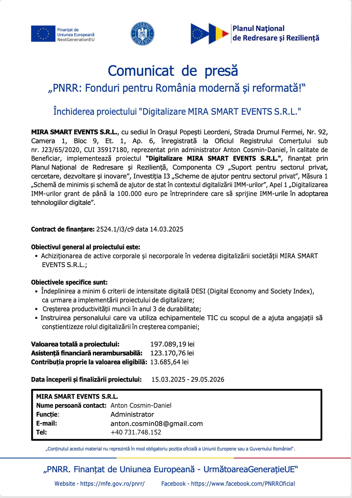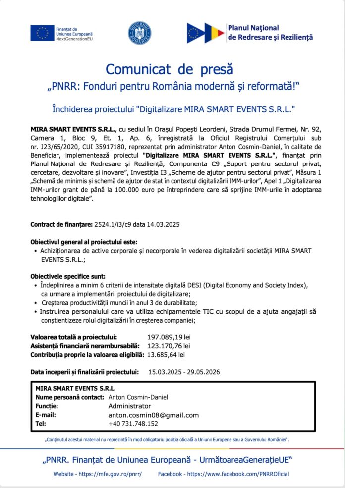 nr. J23/65/2020, CUI 35917180, reprezentat prin administrator Anton Cosmin-Daniel, în calitate de Beneficiar, implementează proiectul „Digitalizare MIRA SMART EVENTS S.R.L.”, finanțat prin Planul Național de Redresare și Reziliență, Componenta C9 „Suport pentru sectorul privat, cercetare, dezvoltare și inovare”, Investiția I3 „Scheme de ajutor pentru sectorul privat”, Măsura 1 „Schemă de minimis și schemă de ajutor de stat în contextul digitalizării IMM-urilor”, Apel 1 „Digitalizarea IMM-urilor grant de până la 100.000 euro pe întreprindere care să sprijine IMM-urile în adoptarea tehnologiilor digitale”.