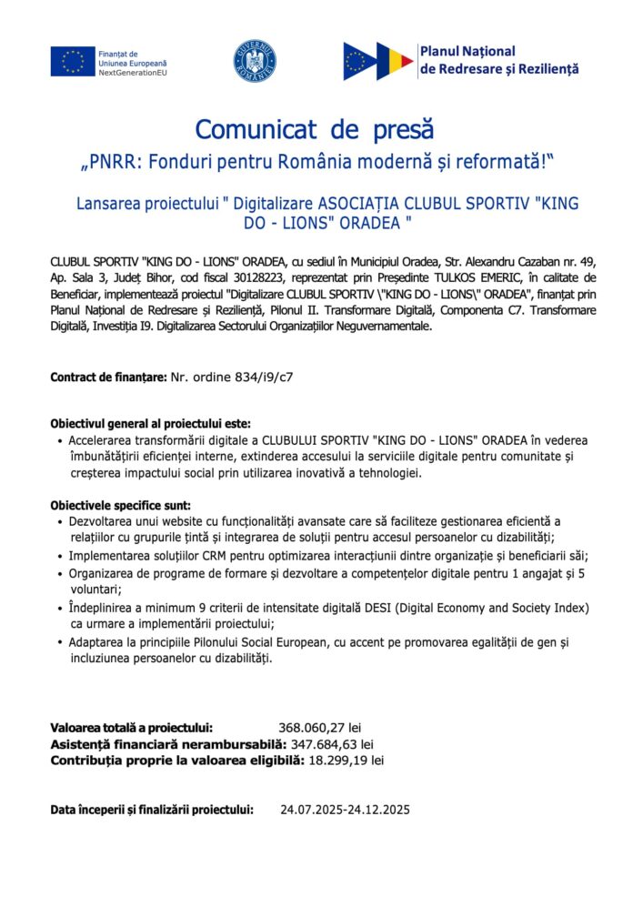 CLUBUL SPORTIV „KING DO – LIONS” ORADEA, cu sediul în Municipiul Oradea, Str. Alexandru Cazaban nr. 49, Ap. Sala 3, Județ Bihor, cod fiscal 30128223, reprezentat prin Președinte TULKOS EMERIC, în calitate de Beneficiar, implementează proiectul „Digitalizare CLUBUL SPORTIV \”KING DO – LIONS\” ORADEA”, finanțat prin Planul Național de Redresare și Reziliență, Pilonul II. Transformare Digitală, Componenta C7. Transformare Digitală, Investiția I9. Digitalizarea Sectorului Organizațiilor Neguvernamentale.