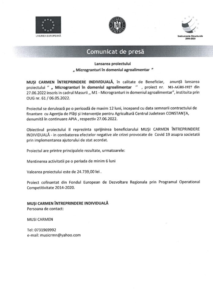 MUȘI CARMEN ÎNTREPRINDERE INDIVIDUALĂ, în calitate de Beneficiar, anunță lansarea proiectului ‘’ „ Microgranturi în domeniul agroalimentar ’’ , proiect nr. M1-AGRI-1927 din 27.06.2022 inscris in cadrul Masurii ,, M1 – Microgranturi in domeniul agroalimentar”, instituita prin OUG nr. 61 / 06.05.2022.
