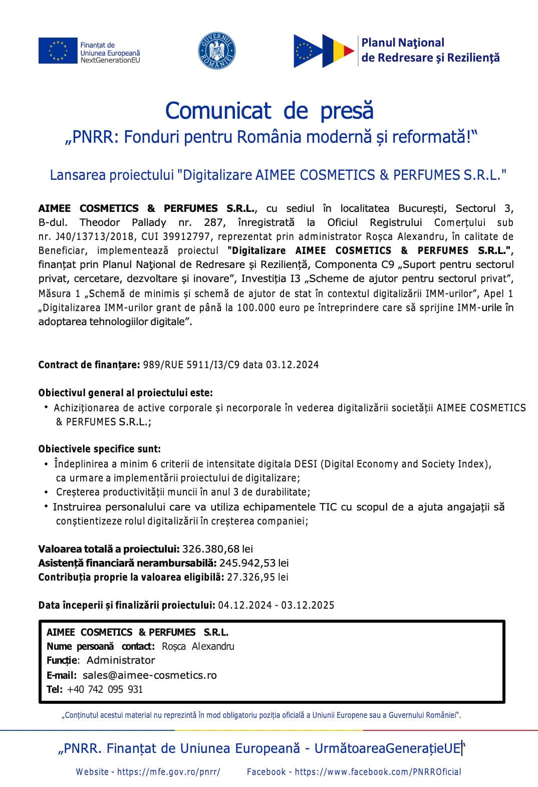 AIMEE COSMETICS & PERFUMES S.R.L., cu sediul în localitatea București, Sectorul 3, B-dul. Theodor Pallady nr. 287, înregistrată la Oficiul Registrului Comerțului sub nr. J40/13713/2018, CUI 39912797, reprezentat prin administrator Roșca Alexandru, în calitate de Beneficiar, implementează proiectul „Digitalizare AIMEE COSMETICS & PERFUMES S.R.L.”, finanțat prin Planul Naţional de Redresare și Reziliență, Componenta C9 „Suport pentru sectorul privat, cercetare, dezvoltare și inovare”, Investiția I3 „Scheme de ajutor pentru sectorul privat”, Măsura 1 „Schemă de minimis și schemă de ajutor de stat în contextul digitalizării IMM-urilor”, Apel 1 „Digitalizarea IMM-urilor grant de până la 100.000 euro pe întreprindere care să sprijine IMM-urile în adoptarea tehnologiilor digitale”.