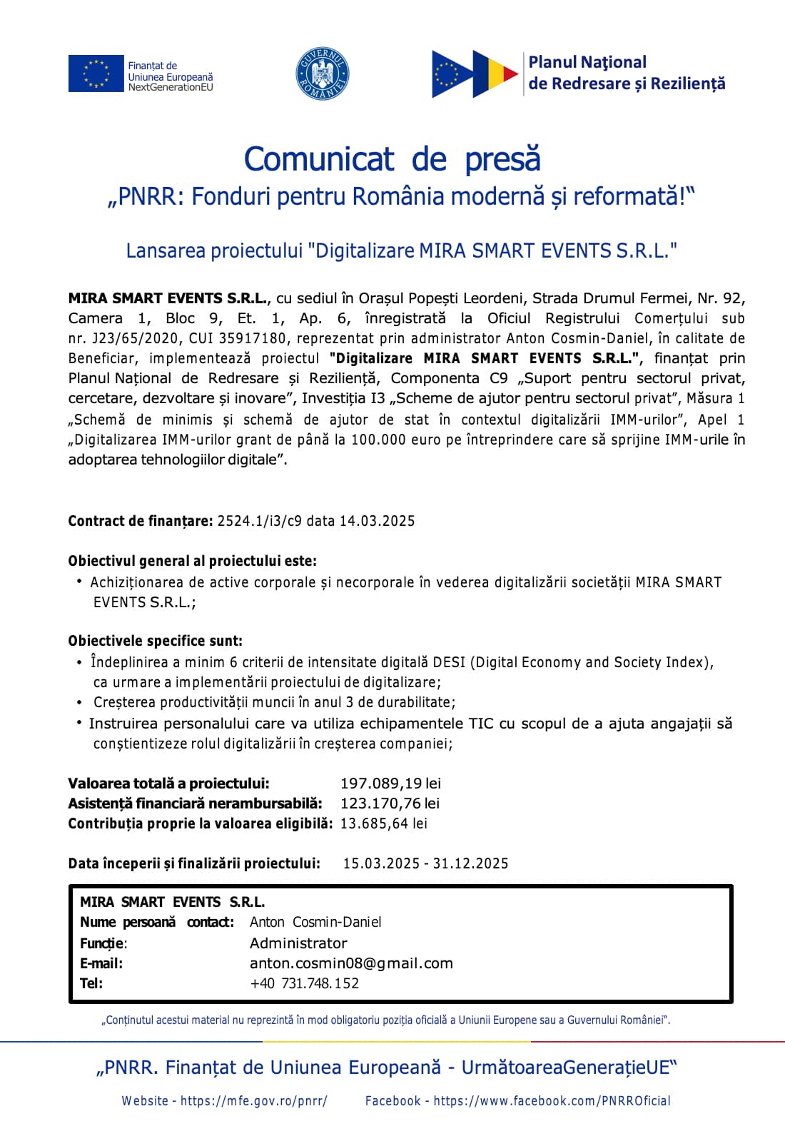 MIRA SMART EVENTS S.R.L., cu sediul în Orașul Popești Leordeni, Strada Drumul Fermei, Nr. 92, Camera 1, Bloc 9, Et. 1, Ap. 6, înregistrată la Oficiul Registrului Comerțului sub nr. J23/65/2020, CUI 35917180, reprezentat prin administrator Anton Cosmin-Daniel, în calitate de Beneficiar, implementează proiectul „Digitalizare MIRA SMART EVENTS S.R.L.”, finanțat prin Planul Național de Redresare și Reziliență, Componenta C9 „Suport pentru sectorul privat, cercetare, dezvoltare și inovare”, Investiția I3 „Scheme de ajutor pentru sectorul privat”, Măsura 1 „Schemă de minimis și schemă de ajutor de stat în contextul digitalizării IMM-urilor”, Apel 1 „Digitalizarea IMM-urilor grant de până la 100.000 euro pe întreprindere care să sprijine IMM-urile în adoptarea tehnologiilor digitale”.