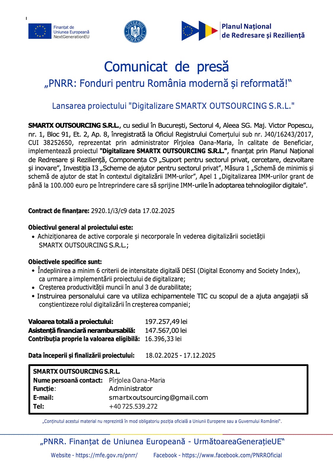SMARTX OUTSOURCING S.R.L., cu sediul în București, Sectorul 4, Aleea SG. Maj. Victor Popescu, nr. 1, Bloc 91, Et. 2, Ap. 8, înregistrată la Oficiul Registrului Comerțului sub nr. J40/16243/2017, CUI 38252650, reprezentat prin administrator Pîrjolea Oana-Maria, în calitate de Beneficiar, implementează proiectul „Digitalizare SMARTX OUTSOURCING S.R.L.”, finanțat prin Planul Național de Redresare și Reziliență, Componenta C9 „Suport pentru sectorul privat, cercetare, dezvoltare și inovare”, Investiția I3 „Scheme de ajutor pentru sectorul privat”, Măsura 1 „Schemă de minimis și schemă de ajutor de stat în contextul digitalizării IMM-urilor”, Apel 1 „Digitalizarea IMM-urilor grant de până la 100.000 euro pe întreprindere care să sprijine IMM-urile în adoptarea tehnologiilor digitale”.