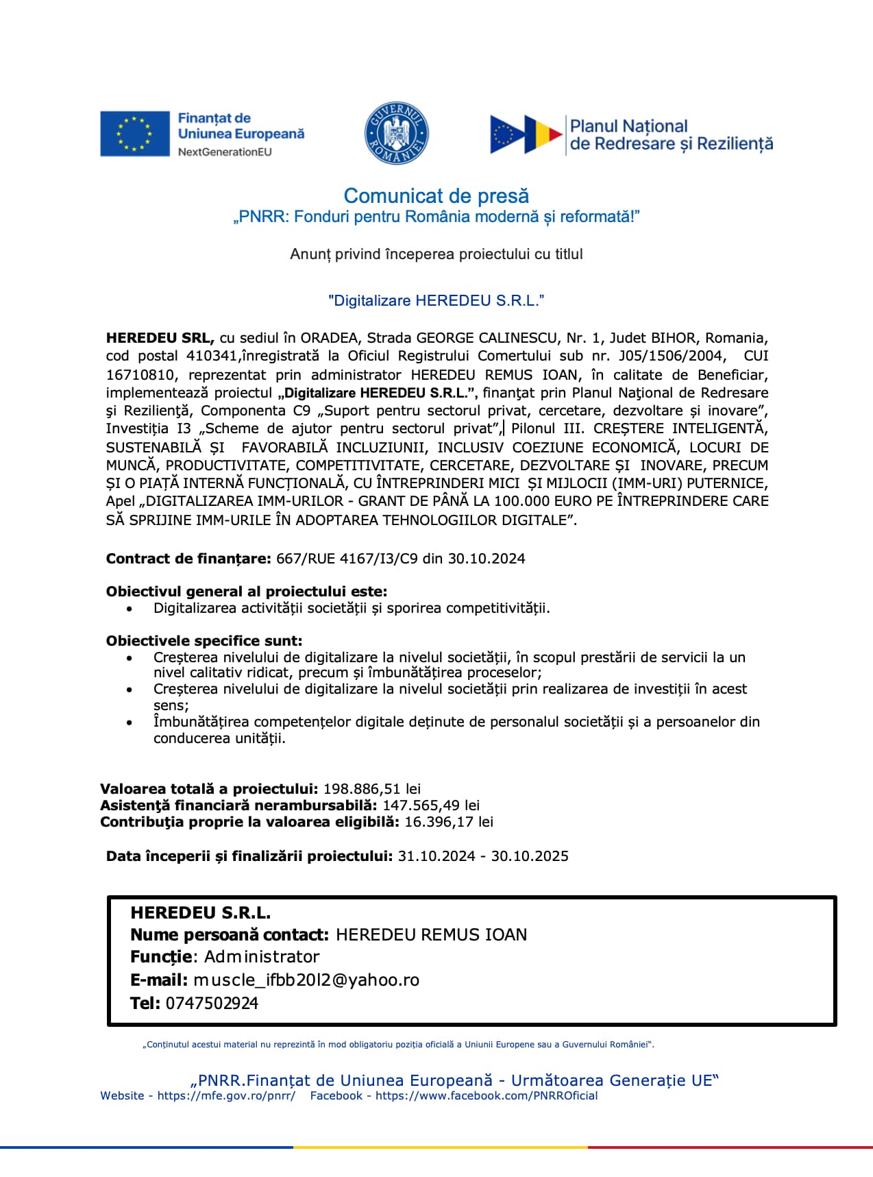 HEREDEU SRL, cu sediul în ORADEA, Strada GEORGE CALINESCU, Nr. 1, Judet BIHOR, Romania, cod postal 410341,înregistrată la Oficiul Registrului Comertului sub nr. J05/1506/2004, CUI 16710810, reprezentat prin administrator HEREDEU REMUS IOAN, în calitate de Beneficiar, implementează proiectul „Digitalizare HEREDEU S.R.L.”, finanţat prin Planul Naţional de Redresare şi Rezilienţă, Componenta C9 „Suport pentru sectorul privat, cercetare, dezvoltare și inovare”, Investiția I3 „Scheme de ajutor pentru sectorul privat”, Pilonul III. CREȘTERE INTELIGENTĂ, SUSTENABILĂ ȘI FAVORABILĂ INCLUZIUNII, INCLUSIV COEZIUNE ECONOMICĂ, LOCURI DE MUNCĂ, PRODUCTIVITATE, COMPETITIVITATE, CERCETARE, DEZVOLTARE ȘI INOVARE, PRECUM ȘI O PIAȚĂ INTERNĂ FUNCȚIONALĂ, CU ÎNTREPRINDERI MICI ȘI MIJLOCII (IMM-URI) PUTERNICE, Apel „DIGITALIZAREA IMM-URILOR – GRANT DE PÂNĂ LA 100.000 EURO PE ÎNTREPRINDERE CARE SĂ SPRIJINE IMM-URILE ÎN ADOPTAREA TEHNOLOGIILOR DIGITALE”.